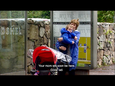 Back on the street, Máire is thanking David for the brilliant advice he gave her, which we think was “put Liam Óg in a crèche,” but that seems so obvious and stupid there must’ve been something more to it that we’ve forgotten. He’s wearing his postman uniform, but there is no mail anywhere in his vicinity, presumably because Áine stole his truck and drove off in it. They run into Fia, and Máire asks her how Liam Óg is doing in the crèche, once again spelled “crÁeche” in the subtitles, and Fia is basically like, “I don’t care, I just shoved him through the mail slot and ran.” Unfortunately for her, she was confused about the location of the crèche and instead dropped Liam Óg off at Nando’s. Before I retire from recapping someday, my goal is to convince you all that Nando’s is inherently funny. Máire reminds her she’d best be on time for her first day of work at the radio station, ha ha, and then brightly suggests that afterward, the three of them celebrate by taking the bus to Galway. I should clarify that “the three of them” refers to Máire, Fia, and Liam Óg, not Máire, Fia, and David, although I’m sure David would enjoy going to Galway on the bus, too, and it’s kind of rude for Máire to not even invite him. She burbles about how his little face lights up when he sees the bus, and I should again clarify that I’m talking about Liam Óg here, although I’m sure I’m not the only one who can easily imagine David’s little face lighting up at the sight of a bus. Fia could not possibly be less enthused about this plan, because as far as she’s concerned the only bus she’s interested in is a bus full of marijuana. I believe that’s the Number 420. Eventually she tepidly agrees to meet Máire and either Liam Óg or David at the bus stop at 1:30, and it’s sweet—but also sad—that this seems to be just about the most exciting thing that has ever happened to Máire in her entire life. It’s even sadder because we know there is no way Fia is going to get it together to make this trip, but we’re getting ahead of ourselves.