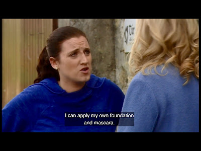 A small mobile Boots makeup counter has been installed in Gráinne’s kitchen, and like the staff at regular Boots, Caitríona is unhappy about being there and wants to make sure everyone knows it. Among her many complaints is the fact that Mo is a no-show, and just then Gráinne gets a text from her saying she’s sick and isn’t going to make it. Caitríona declares this seafóid since she saw Mo out running earlier today, which is of course proof that she can’t possibly be sick since “earlier today” and “now” are the same thing. She talks a little more shit about Mo and then starts applying foundation to Gráinne’s forehead with a trowel. I hope this turns out like that time Caitríona was doing a photo shoot for the Loinnir brochure and dipped her head in a vat of makeup until she looked like Krusty the Clown.