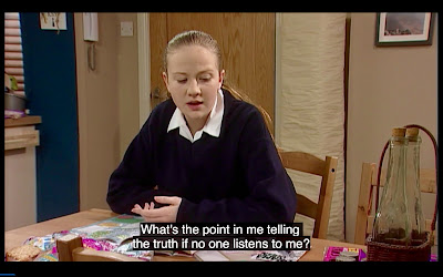 Réailtín answers the door to find Adam has arrived to deliver the bottle of Chardonnay “Laoise” ordered. She explains that Laoise is in the bath right now but she’ll be glad to accept the delivery on her behalf, but he tells her he’s not allowed to give wine to a 12-to-16-year-old girl no matter how devious her scheme is. Just as he’s about to leave, Laoise strolls out of the bathroom in her kimono and character turban, and when he explains what’s going on, she curses her phone, which butt-dials people and she apparently believes also butt-opens apps, puts a bottle of wine in its shopping basket, enters payment information, and arranges delivery. She decides there’s no point in wasting a perfectly good bottle of hooch, though, and sends Adam on his way. After she disappears to resume hour three of her bath, Réailtín grabs the wine and dashes out the door, and I hope this is some kind of elaborate triple-cross in which she hides the bottle inside Áine’s Barbie and then gets Micheál to look in it with a story about a stolen dictionary.