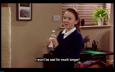 Micheál arrives home and Áine immediately throws Réailtín under the bus in a most genius fashion, complaining to him that Réailtín won’t share her dictionary even though it’s RIGHT THERE IN HER BAG. Réailtín’s eyes grow enormous when she realizes what’s about to happen, but it’s too late, because Micheál looks in her bag and flies into a rage when he discovers the bottle of vodka. Poor Réailtín; Áine’s got her in checkmate when she’d thought they were playing Scrabble.