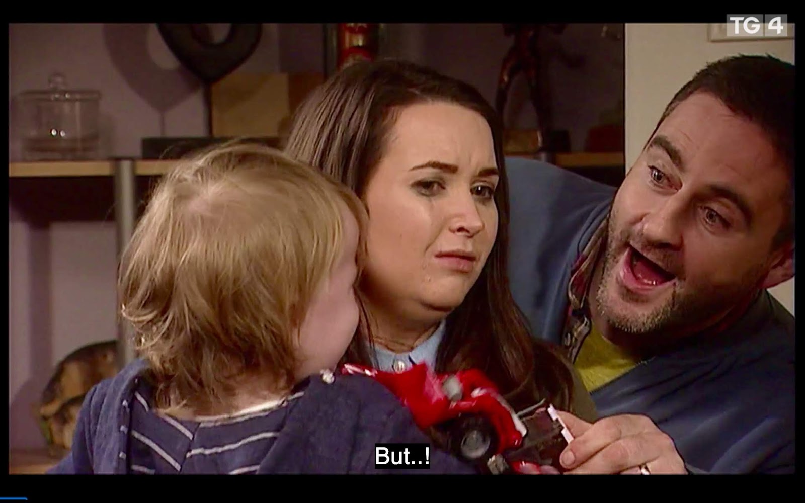 Over at Kidnapping HQ, we all breathe a sigh of relief that everything will be OK because crack superintendent Imelda O’Shea is now on the case. By “crack superintendent” I mean it’s possible she smoked crack on the way over here. She suggests that Katy and Mack shouldn’t beat themselves up over Jay running away because they left the door open, because it’s much more likely a deranged ax murderer broke in and killed him. This does not make them feel better for some reason, so Tadhg helpfully reminds everyone that Katy is a terrible mother in general, not just today. Suddenly a dazed-looking Dee appears in the doorway carrying Jay, who is surprisingly alive. In fact, he seems fairly content until Katy starts screaming his name and clawing at him, and then he starts wailing as he’s handed over to his mother, possibly because someone pinches his leg out of frame during the handover.