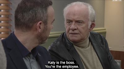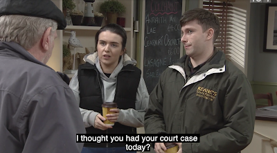Over at the café, intermittent hoodlums Sorcha and Adam are celebrating the fact that she has completed her extensive health and safety training and been certified by the EU to start pumping gas today. I hope there is money in the special effects budget for the inevitable fiery explosion we get when she flicks her lit cigarette at a puddle of spilled gasoline to “burn it off.” Cóilí Jackie arrives and she starts haranguing him because he is dressed inappropriately (i.e., the exact same way he is always dressed) for his court date today, and he pahs and bahs that he’s not going because they’ll fine him either way, and also he’s curious whether failure to appear is a misdemeanor or a felony or what.