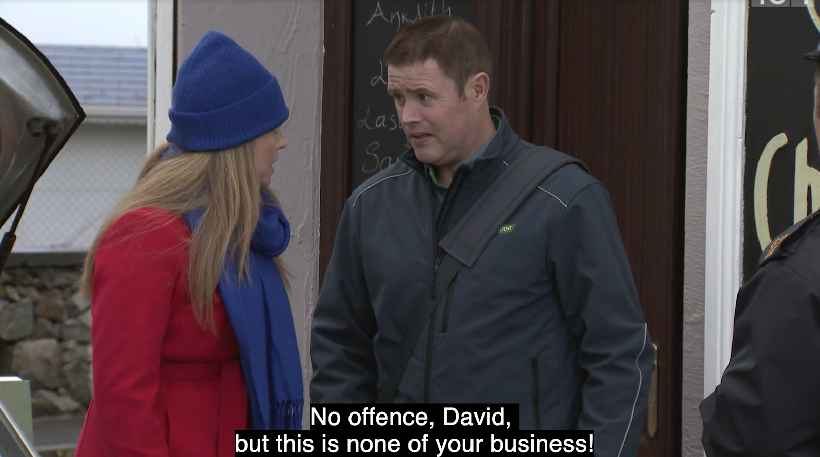 After the break, during which an angry TG4 robot with rollercoasters for arms pollutes the ocean by throwing motorhomes in it, Tony and Berni are arguing again, this time over a tip. This is why it is always important for both parties to clarify the meaning of “just the tip” before proceeding. There is back-and-forthing, and when Tony says she sounds like she wants to forget their relationship ever happened—as do we all—she protests that they were only together for two seconds, which is barely half the duration of most of her relationships. Of course, most of Tony’s life consists of shooing cows out of the road, so two seconds with Berni is the most exciting thing that has ever happened to him and he is very invested in it, so he does not seem to appreciate her dismissing it as just one of the many things that has happened to her recently, such as brushing her hair or putting out the many fires Bobbi Lee has started while trying to make toast.