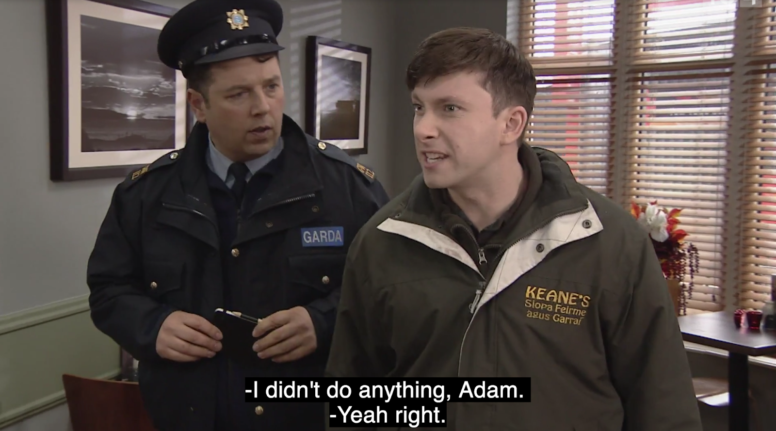 Back at the café, Sorcha is fretting to her new BFF Adam that she’s worried the judge will punish Cóilí Jackie more severely if he doesn’t show up to court, but Adam replies that he has trouble feeling sorry for him considering he brought all this on himself by dumping all that manure on that orphan or whatever. Who can remember? She starts banging on about poor Cóilí this and pitiful Jackie that, and then Adam helpfully points out that Cóilí Jackie actually has had a hard time of it lately, especially the bit where Sorcha slammed his head into a table and ran away with all his money while he bled out on the floor. He walks out as she sighs heavily and rolls her eyes, and this definitely seems like a solid friendship that will last through good times and bad, by which I mean approximately four minutes.